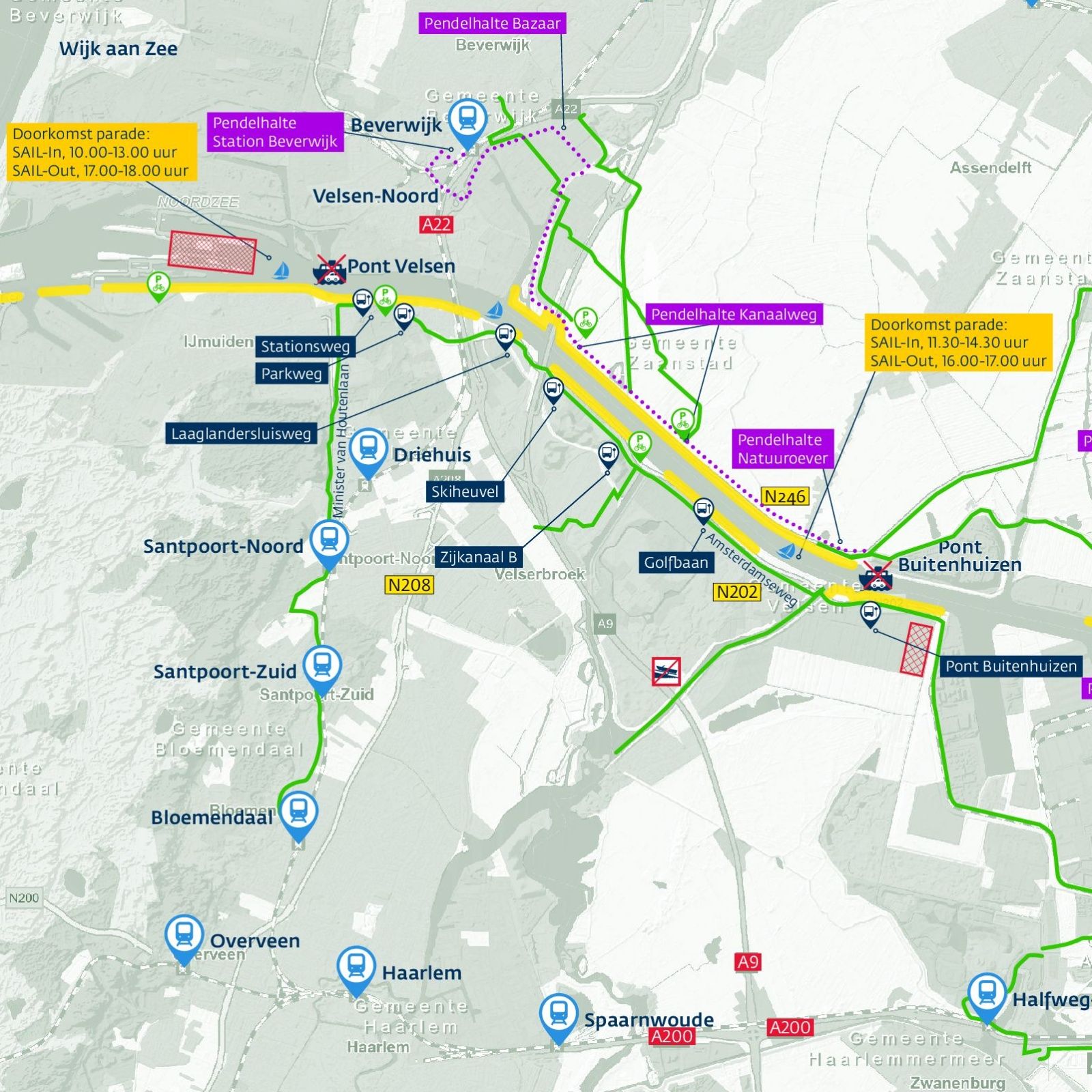 Om te zorgen dat het publiek veilig langs de kade naar de parade kan kijken én om parkeeroverlast in de wijk te voorkomen, worden verschillende wegen afgesloten op 20 en 24 augustus. Het gaat onder andere om de Amsterdamseweg (N202), Kanaaldijk en het Sluizencomplex in IJmuiden en de Kanaalkade (N246) in Zaandam. Ook de pontjes bij Buitenhuizen, Velsen en de Hempont in Zaandam varen beperkt of helemaal niet tijdens piekmomenten. Een volledig overzicht is te zien op de website van de provincie. Volg de gele borden en de aanwijzingen van verkeersregelaars. Op de andere dagen zijn deze wegen open. Bewoners langs de afgesloten wegen ontvangen via de gemeente een brief met informatie en eventueel een benodigd doorlaatbewijs.