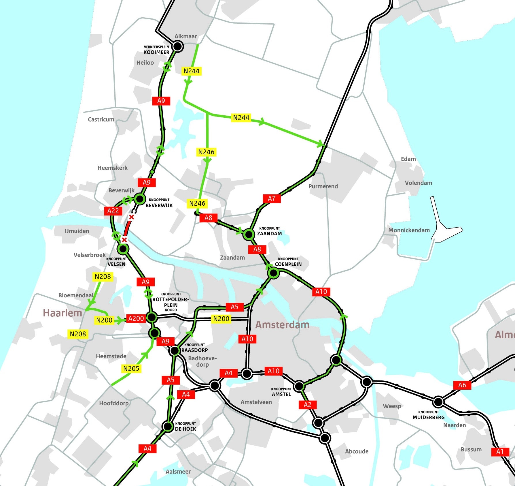- Verkeer dat gebruik maakt van de N208 richting de A22 bij IJmuiden wordt geadviseerd via de N200 naar knooppunt Rottepolderplein te rijden en daar de A22 te nemen richting Alkmaar.